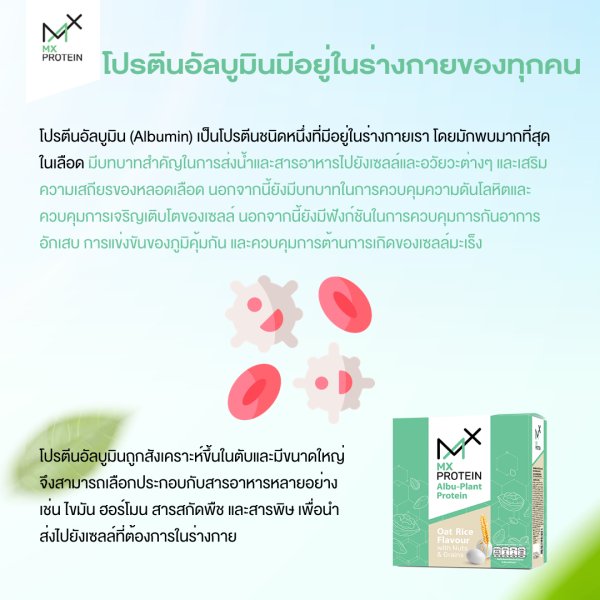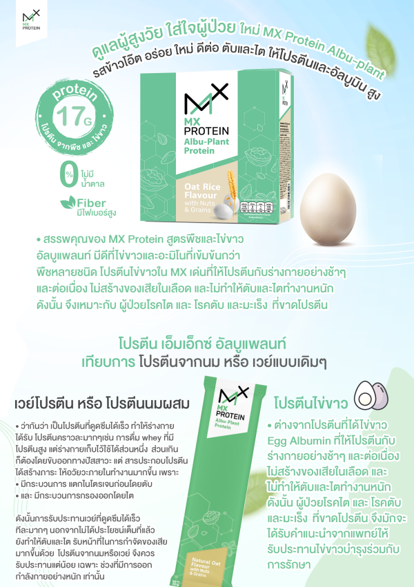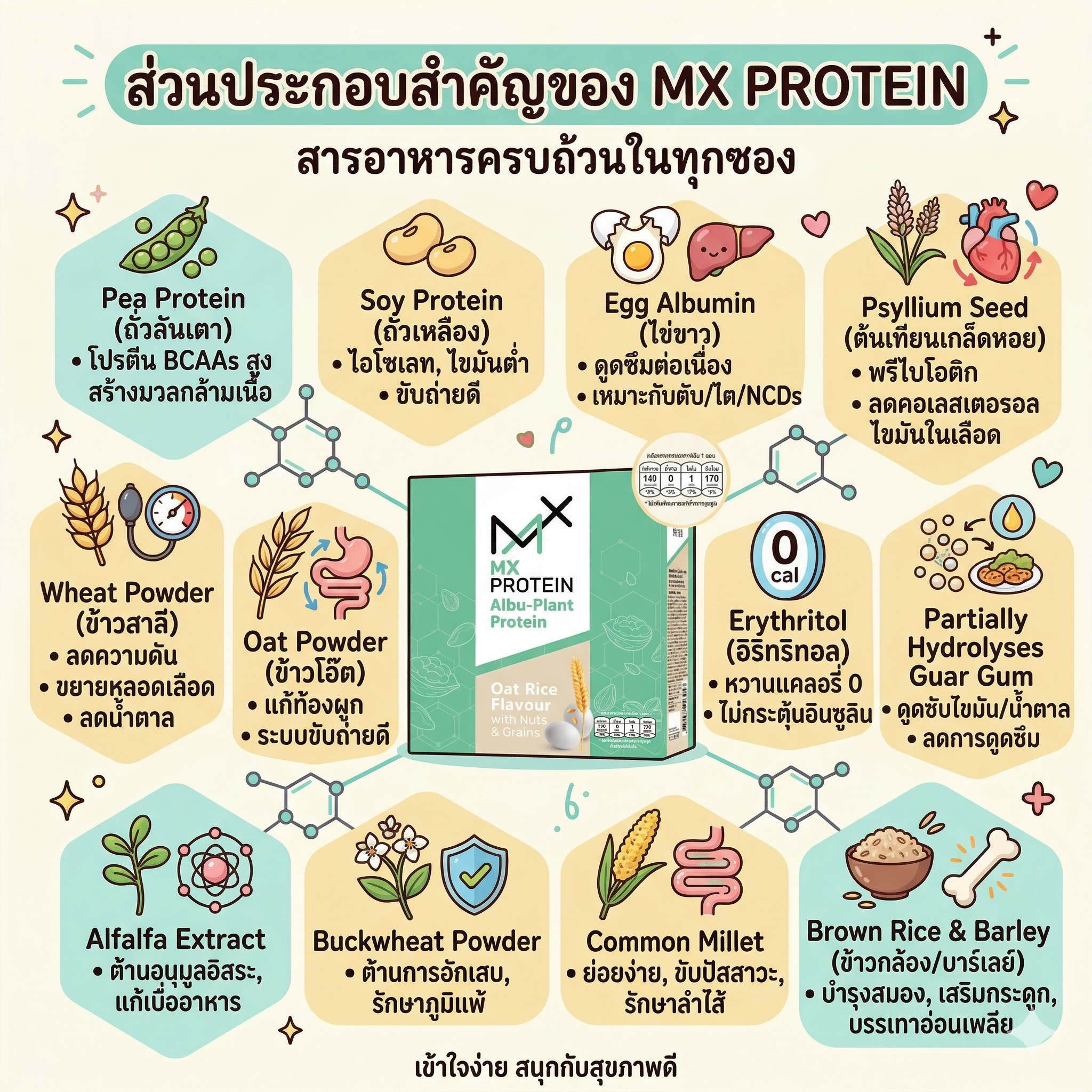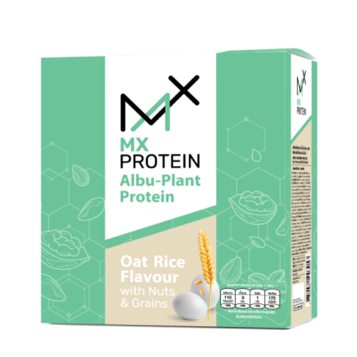 MX Protein, เอ็ม เอ็กซ์ โปรตีน, Albu-Plant Protein, Plant Protein, Albumin Protein, Oat Flavour, Oat Flavor, โปรตีนพืช, โปรตีนไข่ขาว, ผลิตภัณฑ์เสริมอาหาร, โปรตีนทางเลือก, โปรตีนสุขภาพ, โปรตีนสำหรับผู้สูงอายุ, โปรตีนสำหรับคนดูแลสุขภาพ, โปรตีนจากถั่วลันเตา, โปรตีนจากถั่วเหลือง, โปรตีนจากไข่ขาว, Psyllium Seed Powder, Pea Protein, Soy Protein, Egg Albumin, Oat Powder, Wheat Powder, Guar Gum, Erythritol, Alfalfa Extract, Buckwheat Powder, Millet Powder, Brown Rice Powder, Barley Powder, วิตามินรวม, ไฟเบอร์, พรีไบโอติก, ระบบขับถ่าย, โปรตีนดูดซึมช้า, โปรตีนเสริมกล้ามเนื้อ, อาหารเสริมสุขภาพ, โปรตีนชงดื่ม, oat rice protein, nutritional supplement, healthy protein drink, daily protein, protein blend, wellness nutrition, digestive support, muscle support, premium supplement, Thai supplement, bilingual product page